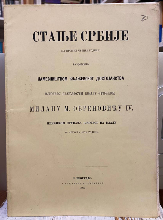 Pun naslov: Stanje Srbije za prošle četiri godine razloženo namesništvom knjaževskog dostojanstva njegovoj svetlosti knjazu srpskom Milanu M. Obrenoviću IV prilikom stupanja njegovog na vladu 10. avgusta 1872. godine